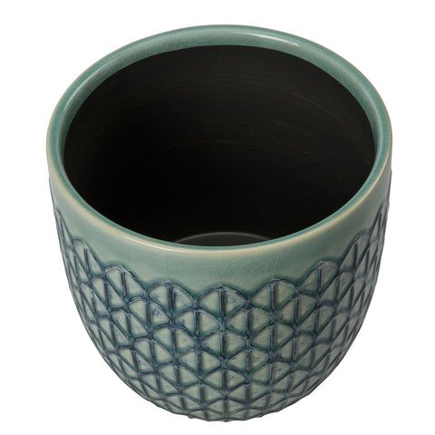 The raised pattern of this stoneware pot has an organic look, recalling feathers perhaps, or scales. Glazed in a beautiful celadon green/blue shade, the subtle crackle effect adds interest. A dark blue colour wash picks out the design with a soft dappled finish, bringing an artisanal feel. This indoor plant pot will bring the colour and pattern – now just choose a statement plant for an instant style update!