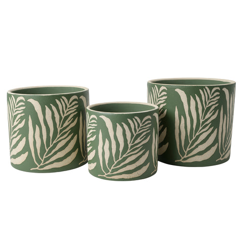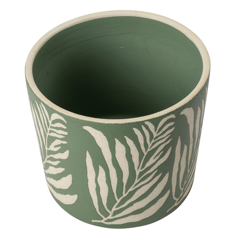The stoneware pot has a textured, slightly grainy finish. It has been finished using a wax resist technique, with the leaf pattern left unglazed and surrounded by a matte glaze in a soft green. This indoor plant pot will bring the colour, texture and pattern – now just choose a statement plant for an instant style update!